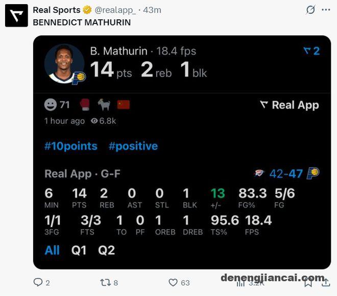 首节卡莱尔一分钟没让他打,第二节登场短短6分钟里6中5+三分1中1+罚球3中3拿到14分2篮板1盖帽,他帮助步行者直接将落后9分到反超4分,真实命中率95.6%,马瑟林单节14分也是两队最高,全场球迷都在欢呼他的名字。