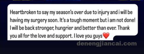 如今阿拉基通过社媒宣布自己赛季报销的消息:“令人心碎,我因为这次受伤(被许钟豪撞伤)提前赛季报销,我将很快去接受手术。这是一个艰难的时刻,但我不会放弃!我会变得更强,以更渴望和更好的状态回归。感谢大家的爱与支持,爱你们!”
