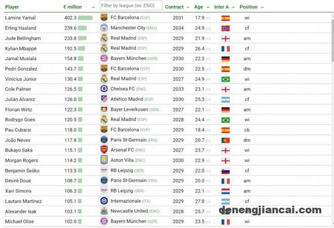 直播吧6月6日讯 根据CIES足球天文台的统计模型,在和巴萨续约至2031年后,天才小将亚马尔成为转会市场价值最高的球员,达到了4.023亿欧元。这一惊人的数字与他还未满18岁时所展现出的非凡表现密切相关,而大多数球员在这个年龄才刚刚开启职业生涯。