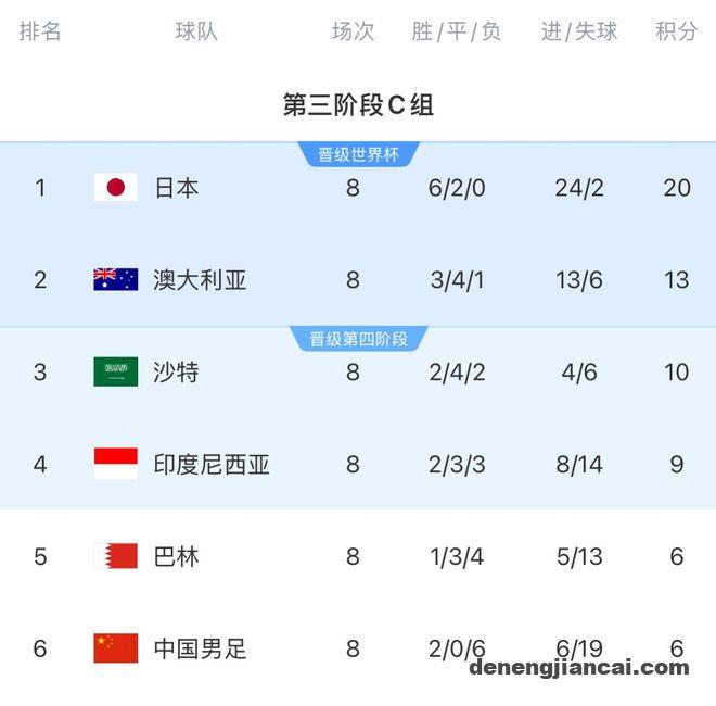 世预赛C组积分榜: