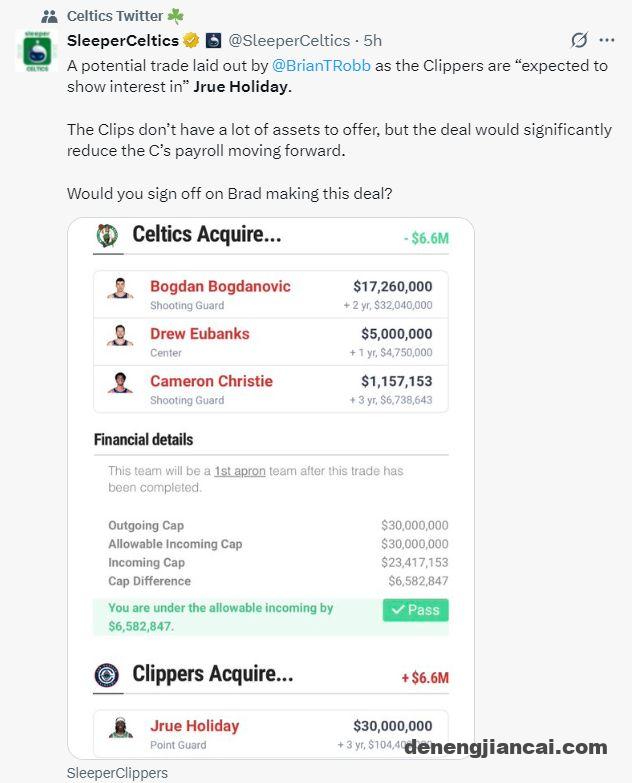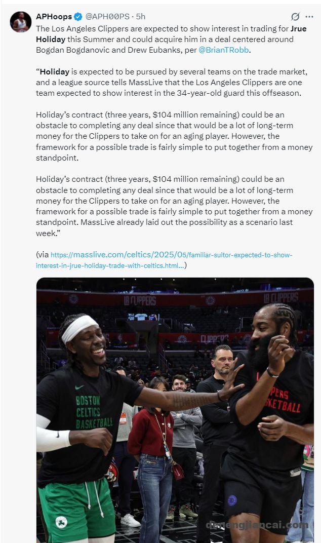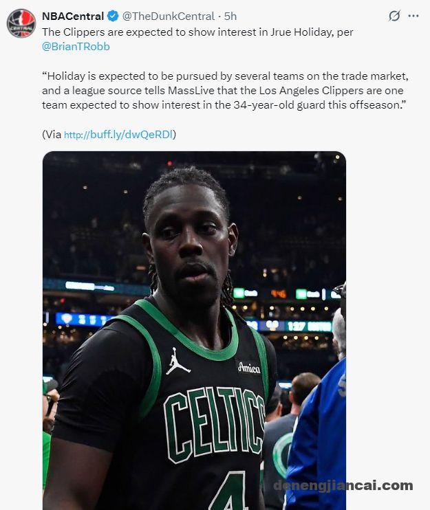 北京时间5月29日,NBA记者Brian Trobb报道,预计休赛期洛杉矶快船会对凯尔特人后卫朱-霍勒迪感兴趣,LAC也是联盟对霍勒迪最感兴趣的球队,绿凯需要一些到期合同来为他们未来减税。