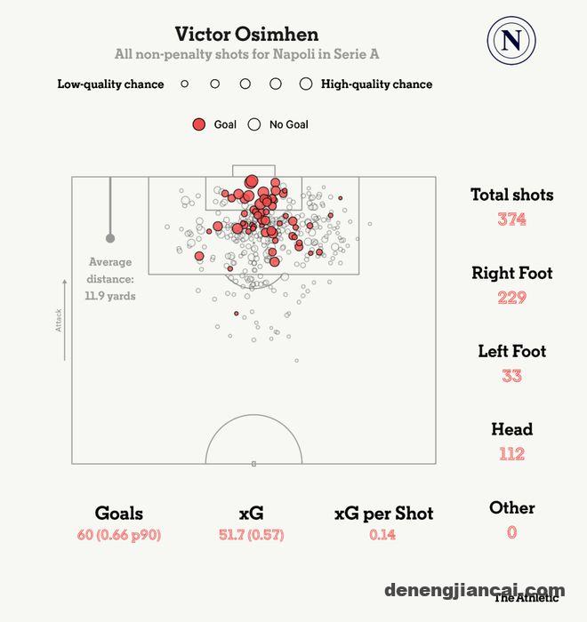 在加拉塔萨雷,奥斯梅恩41场比赛打入了37球,其中联赛30场26球。此前效力那不勒斯时,他连续4个赛季保持类似进球率,意甲场均射门超过4次。在球队夺冠的2022/23赛季,意甲各队防线想方设法限制他,还是让他进了26球,赢得金靴奖。
