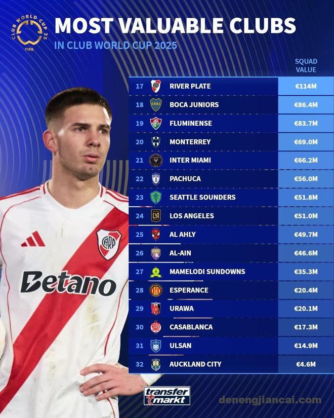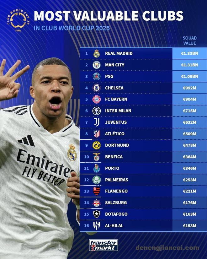 2025年世俱杯即将打响,转会市场网统计了32支参赛队的总身价并进行了排名。