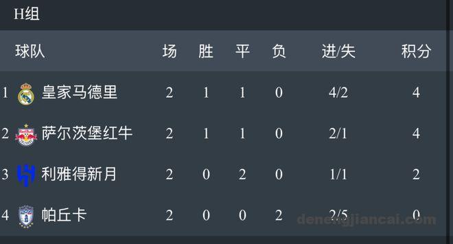 北京时间6月23日,世俱杯H组第2轮的比赛已全部结束,次轮比赛过后,皇马积4分暂时位列榜首,萨尔茨堡红牛同样积4分,因净胜球劣势位列次席,利雅得新月积2分位列第3,帕丘卡则0分垫底提前出局。