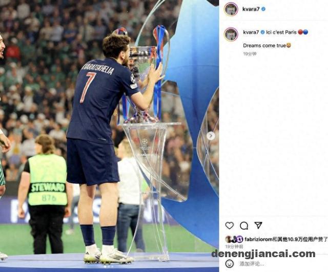赛后,巴黎前锋克瓦拉茨赫利亚更新社媒晒照并配文写道:此地唯属巴黎 梦想终成真