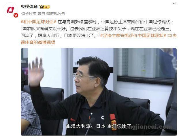 在与青训教练座谈时,中国足协主席宋凯评价中国足球现状:“国家队层面确实没干好。过去我们在亚洲还算技术尖子,现在在亚洲已经是三、四流了,跟澳大利亚、日本更没法比了。”