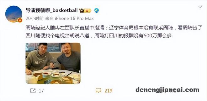 就在日前,周琦的经纪人睢冉在直播中对此事进行了回应,他表示辽宁体育局今年根本就没有联系过周琦,在周琦决定代表四川队打全运会后,辽宁体育局随便找了个电视台胡说八道。至于周琦代表四川队打全运会的费用,睢冉表示也没有600万那么多。对于睢冉的说法,很多球迷都不相信,并认为他和周琦一样,都对钱看得太重。