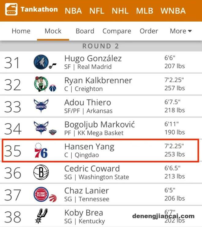 就在日前,美国知名模拟选秀网站Tankathon在NCAA球员退选截止日后更新了2025年NBA模拟选秀排名。杨瀚森预计会在总第35顺位被费城76人选中。和之前预测杨瀚森会被第20顺位选中的NBA Draft Room网站不同,Tankathon的专业性更强,而且预测的成功率更高。自从杨瀚森宣布参加选秀开始,他在Tankathon的选秀顺位也是一路高升,从最开始的第59顺位到第41顺位,目前更是涨到了第35顺位。目前来看的话,杨瀚森真有冲击首轮的可能性!