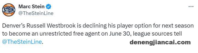 北京时间6月13日,据名记Stein报道,掘金后卫的拉塞尔-威斯布鲁克将拒绝执行下赛季的球员选项,并于北京时间7月1日成为完全自由球员。