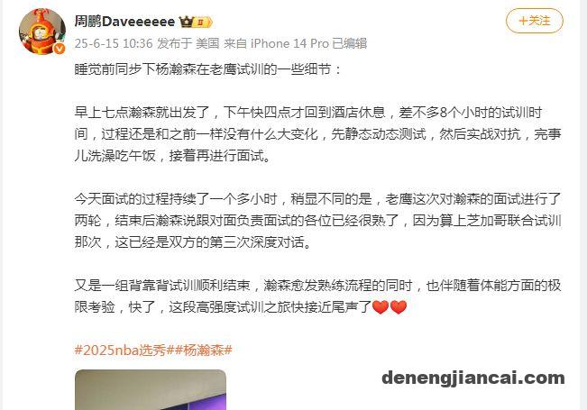 “又是一组背靠背试训顺利结束,杨瀚森愈发熟练流程的同时,也伴随着体能方面的极限考验,快了,这段高强度试训之旅快接近尾声了。”