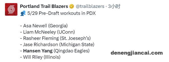 北京时间5月30日,开拓者官方宣布了今日试训的名单,其中包括中国球员杨瀚森。开拓者成为了杨瀚森单独试训的第一站。开拓者拥有今年首轮第11号签,去年他们也试训了当时报名NBA选秀的中国球员崔永熙。