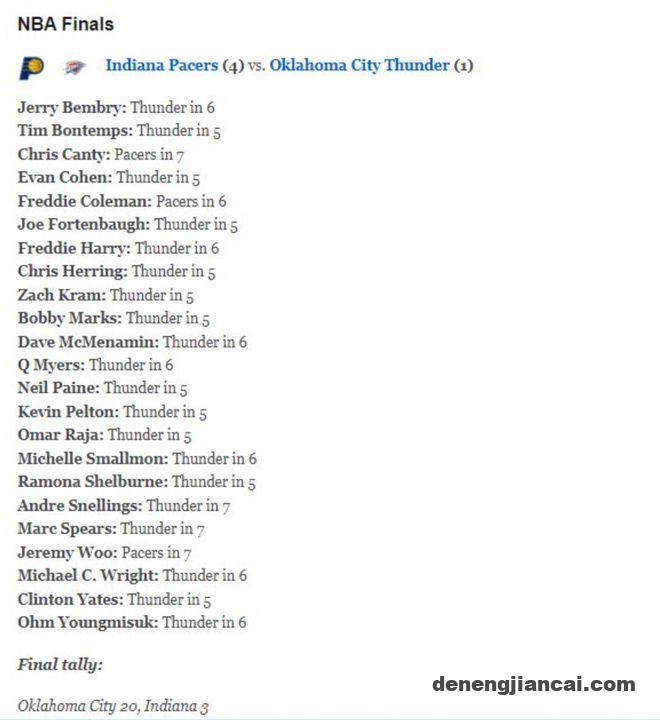NBA总决赛将于明天正式开打,ESPN的23位专家对本赛季的总冠军归属进行了预测,其中有20人支持雷霆夺冠,只有3人看好步行者夺冠。