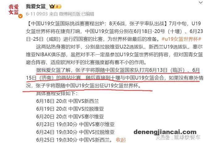 据悉,U19女篮在接下来会有两站热身赛,分别是6月18-20日,以及6月23-25日,他们将在8天里进行6场热身赛,对手分别是新西兰、拉脱维亚以及塞尔维亚。对于中国队而言,这也是他们出战U19世界杯之前,最为重要的一次热身赛。而根据知情人士透露,张子宇在代表中国队参加完2场热身赛后,她将会暂时离队,前往U19女篮报道,并且跟随球队出战接下来的热身赛。而且,根据她的透露,如果没有出现意外的话,张子宇将会代表U19女篮出战世界杯。