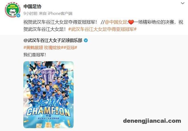 中国足协发文祝贺:“祝贺武汉车谷江大女足夺得亚冠冠军!”