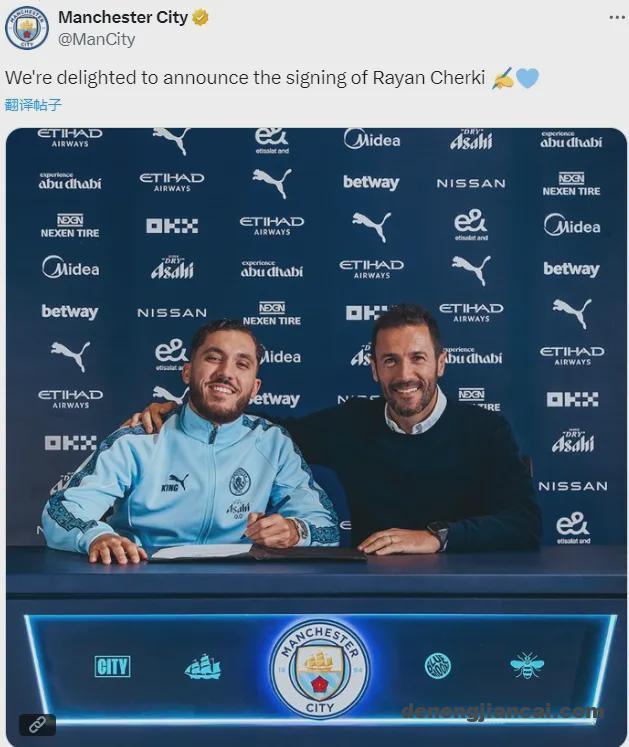 官方:曼城宣布从里昂签下了切尔基,双方签下了一份2030年到期的合同。
