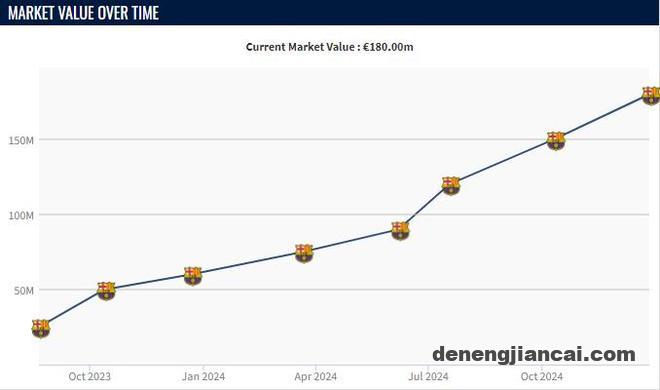 本赛季是亚马尔出道以来的第二个完整赛季,俱乐部数据与首个完整赛季(23/24赛季50场7球9助攻)相比有了大幅进步。此外,亚马尔的身价也在17岁这一年突飞猛进,从9000万欧飙升到1.8亿欧。