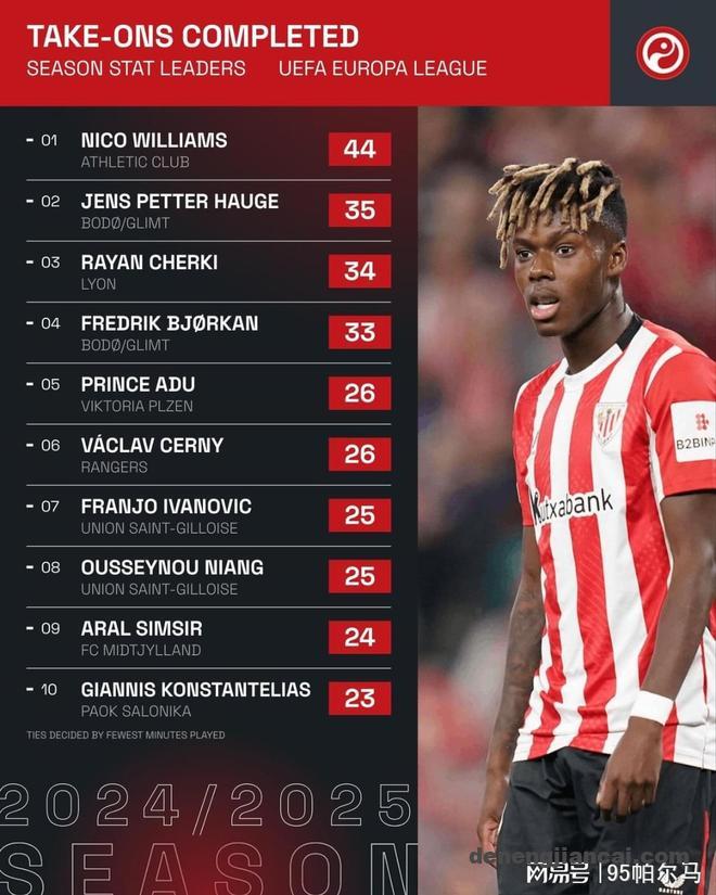 众所周知,2024-25赛季的尼科·威廉斯遭遇了伤病袭击(脚踝伤势),经历了低走模式(2月份才复苏),5粒进球和5次助攻的西甲成绩单并没有满足趁胜追击的外界期望,虽然尝试过人成功的次数与亚马尔持平(190次),然而成功过人的次数和效率则是云泥之别(161:70)。