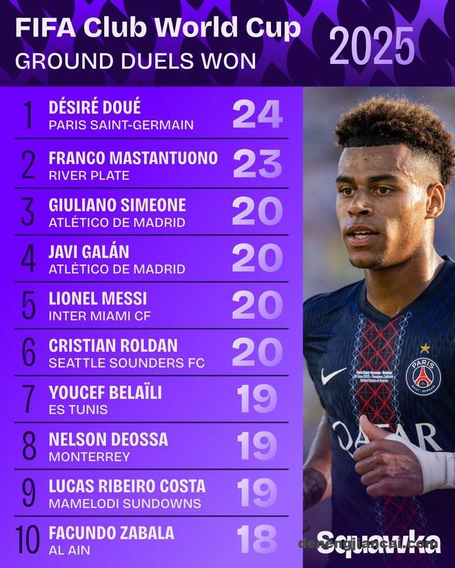 据统计,巴黎圣日耳曼前锋杜埃是本届世俱杯小组赛阶段赢得地面对抗次数最多的球员,梅西则在这项数据上位列第五。