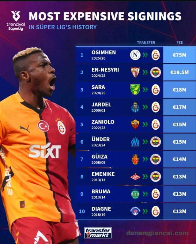 当地时间周三晚,奥西门飞抵伊斯坦布尔,在机场受到大批球迷的热烈(如果不是狂热的话)欢迎。据悉,这位26岁的尼日利亚中锋将和加拉塔萨雷签下一份3+1合同,年薪1500万欧元,外加奖金。7500万欧元的转会费,则大幅打破了土耳其的引援身价纪录,据“德转”数据,此前土耳其联赛的最高引援纪录是安-奈西里,摩洛哥人去年以1950万欧元价格从塞维利亚转会费内巴切——算上浮动款项,奥西门让这个纪录翻了四倍!