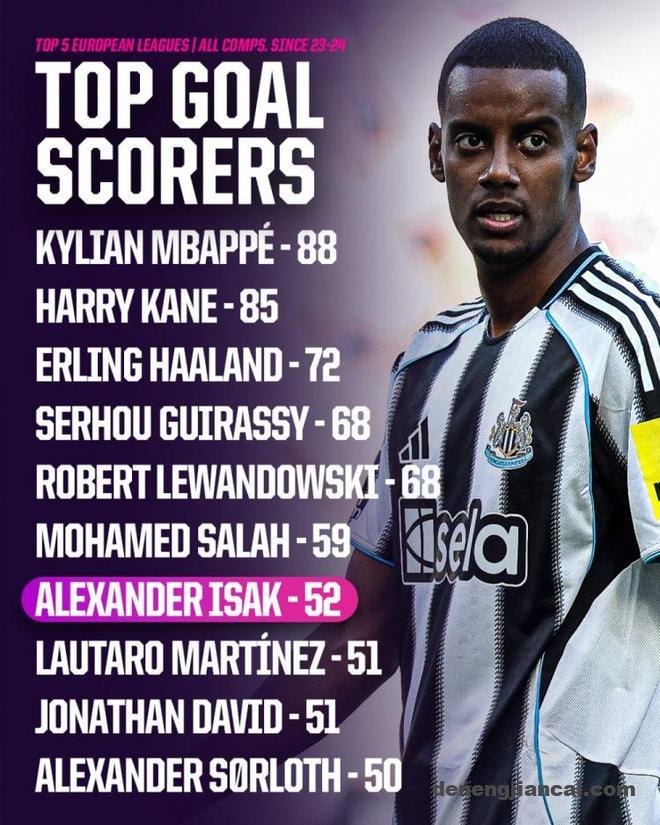 据Opta统计,2023-2024赛季以来,伊萨克各赛事打进52球,五大联赛球员第7多。