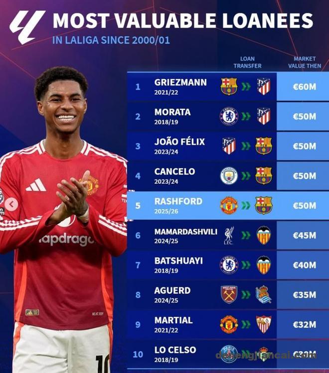 直播吧7月24日讯 巴萨已经官宣租借曼联前锋拉什福德,《转会市场》统计显示后者也是新世纪西甲租借的身价并列第二贵球员。