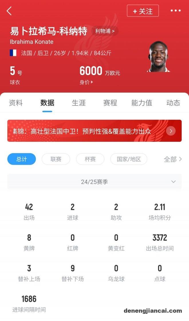 科纳特,现年26岁,法国中卫,上赛季代表利物浦出战42场比赛,贡献2球2助,目前德转身价6000万欧。
