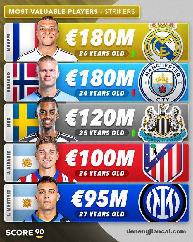 皇马前锋姆巴佩与曼城前锋哈兰德同以1.8亿欧元并列榜首。纽卡斯尔联射手伊萨克以1.2亿欧元排名第三。马竞前锋胡利安-阿尔瓦雷斯以1亿欧元位列第四,国际米兰的劳塔罗-马丁内斯则以9500万欧元排名第五。