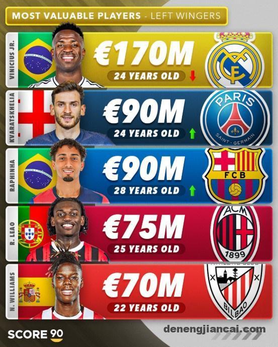 直播吧6月13日讯 2024-25赛季结束,Score 90更新了左边锋的身价排行,皇马攻击手维尼修斯1.7亿欧元第一,巴黎圣日耳曼的克瓦拉茨赫利亚以及巴萨的拉菲尼亚都是9000万欧元。